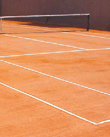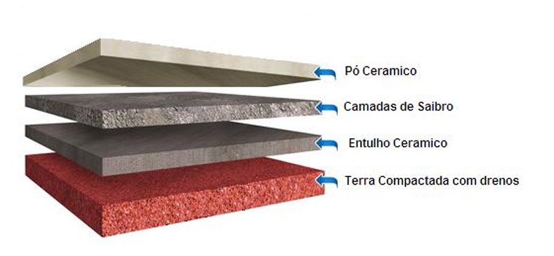 A quadra de saibro é composta por terra e argila, consiste em uma camada de caco de tijolos, camada de saibro e acabamento em pó de telha.