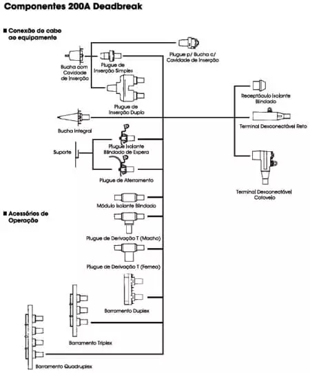 Os acessórios 200A Deadbreak oferecem um meio rápido para conectar e desconectar cabos e equipamentos em sistemas de potência. Todos os acessórios devem ser desenergizados antes da operação e devem ser fixados mecanicamente por meio de ferragens fornecidas junto ao componente quando ligados. Os componentes podem ser tamponados e isolados com capuzes, plugues e buchas. A linha 200A Deadbreak possui também acessórios para aterrar e derivar o sistema. Pontos adicionais de conexão podem ser obtidos com o uso de barramentos e plugues by-pass. Todos os terminais tipo cotovelo e reto deadbreak estão equipados com ponto de teste capacitivo. Os acessórios Deadbreak 200A fabricados conforme norma ANSI/IEEE 386 também atendem o padrão europeu IEC/CENELEC classe 250A.